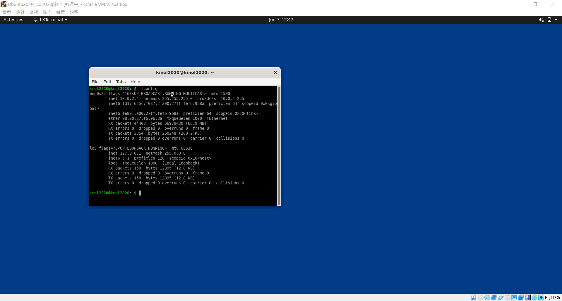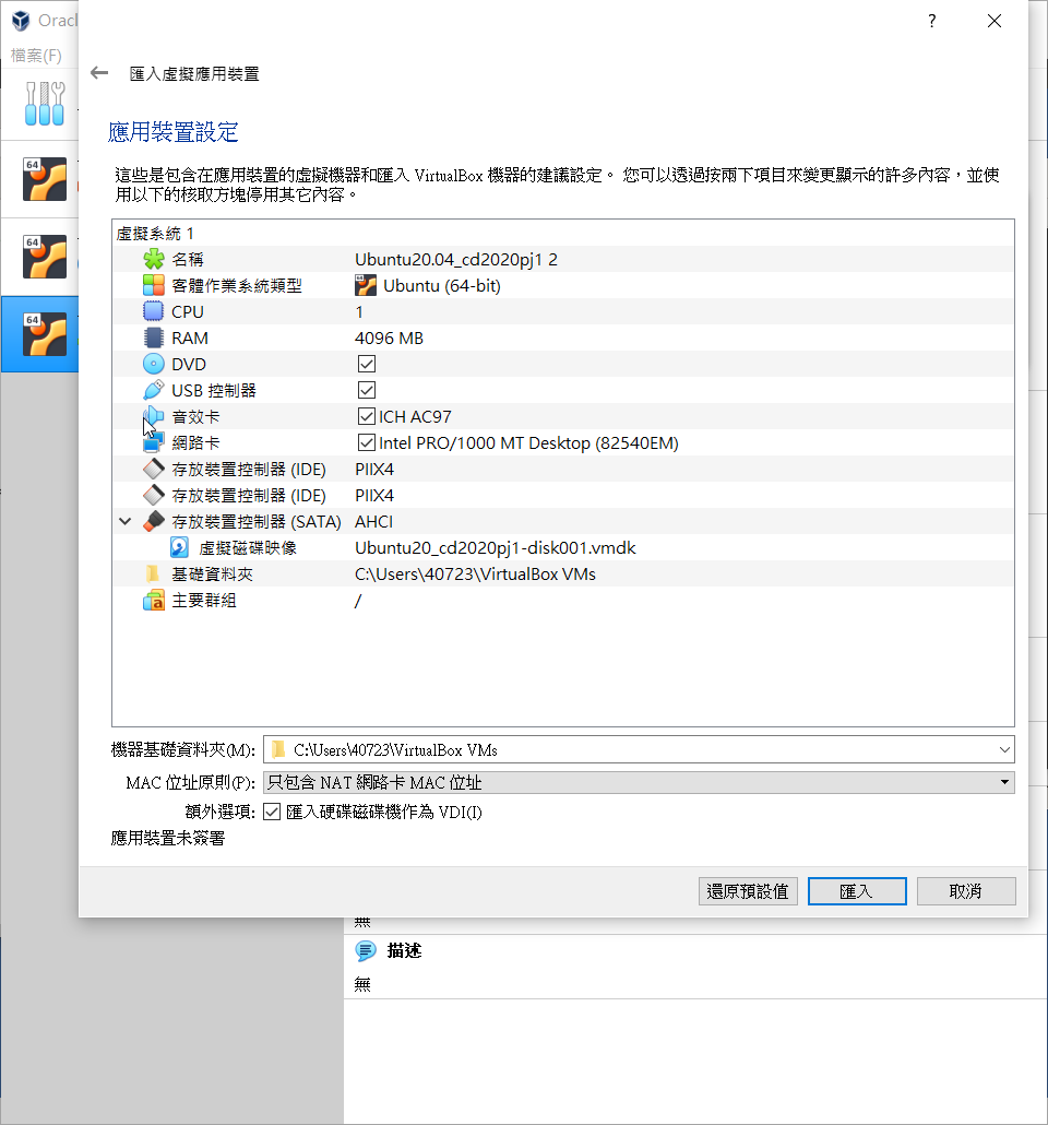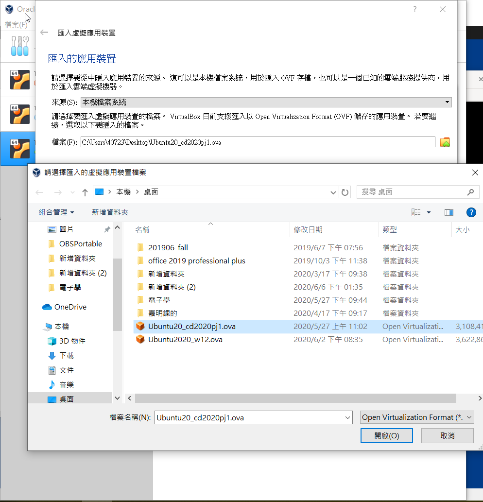 開啟virtualbox 使用導入 Ubuntu20_cd2020pj1.ova Ubuntu2020_w12.ova 這兩個檔案 (附註: 這兩個檔案放在桌面)