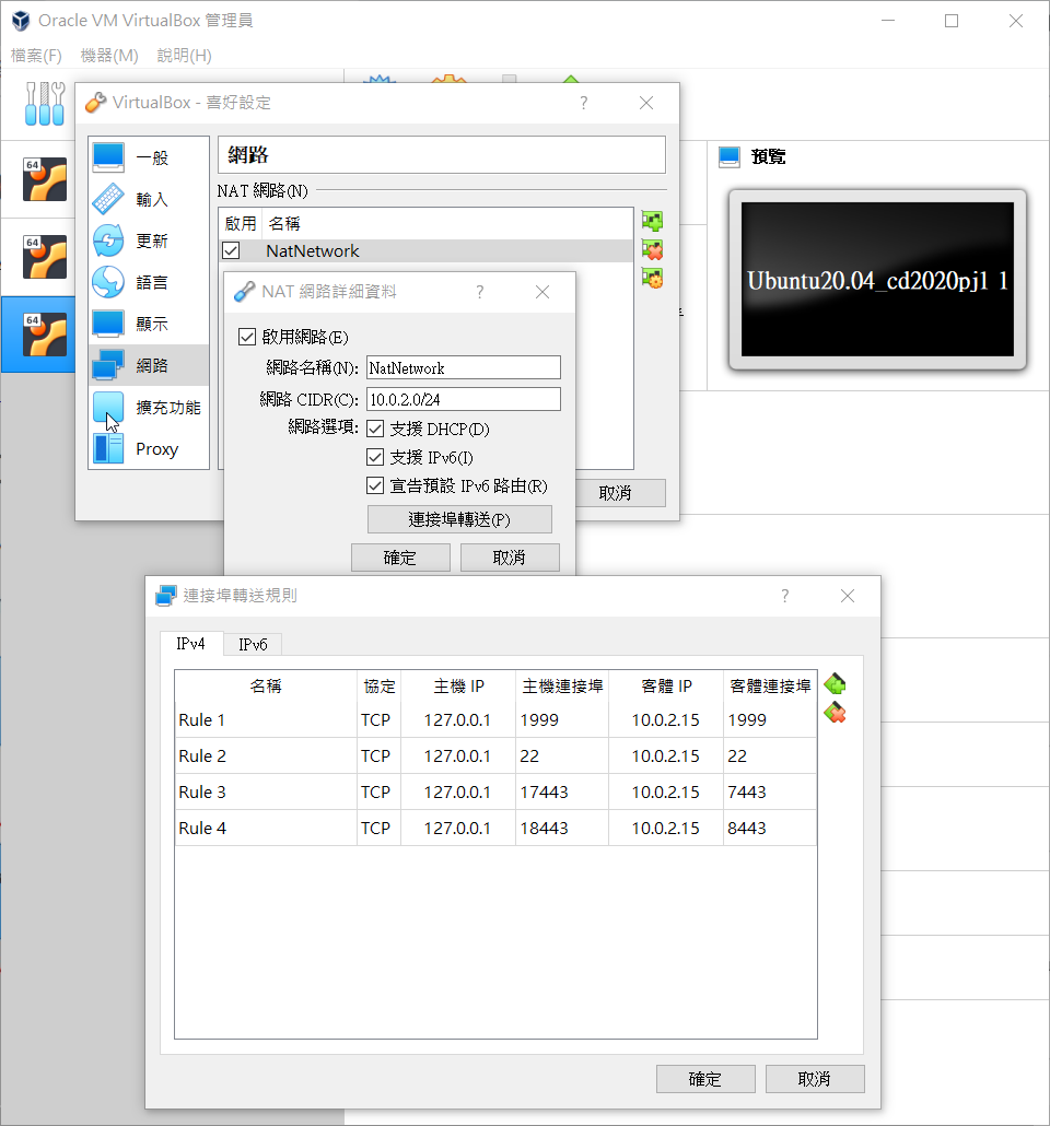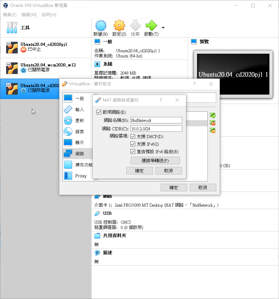 回到virtualbox 進入 喜好設定->網路-> 新增NetNeteork-> 網路 CIDR(C) 10.0.2.0/24