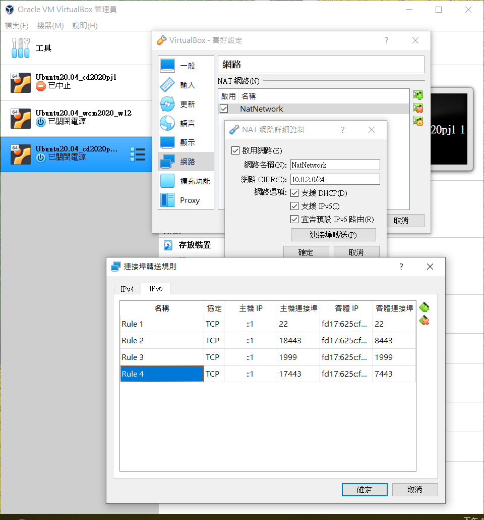 回到virtualbox 進入 喜好設定->網路-> 新增NetNeteork-> 網路 CIDR(C) 10.0.2.0/24