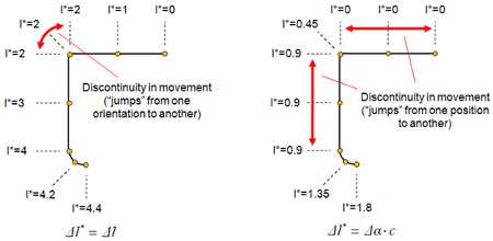 路徑位置*被描述為沿路徑的累積(線性變化,如果不為零,否則為角度**)。路徑長度*由下式給出:
