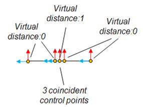 要歸檔沿路徑的特定點處的運動暫停,請執行以下操作:創建3個相同的路徑控制點(位置和方向完全重合),並為中間控制點指定一個虛擬距離值,該值不得為零。在下面的示例中,在3個重合點的虛擬距離為2(在第一和中間重合控制點之間為1,在中間和第三重合控制點之間為1)。如果某個對像以每秒1米的速度沿路徑行進,則它將在重合的控制點處記錄2秒的暫停