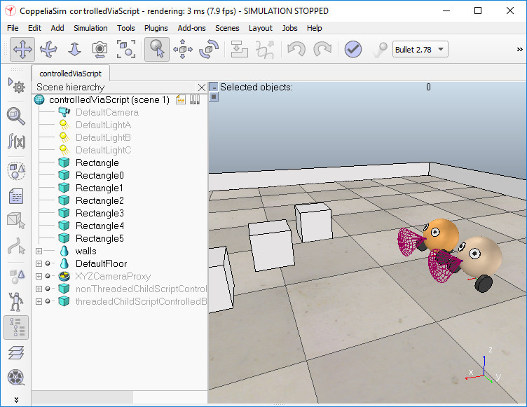 最方便的方法是編寫一個子腳本來處理給定機器人或模型的行為。這是最方便的方法,因為子腳本直接附加到場景對象,它們將與相關的場景對像一起復制,它們不需要使用外部工具進行任何編譯,它們可以在線程或非線程模式下運行,它們可以通過自定義Lua函數或Lua擴展庫進行擴展。使用子腳本的另一個主要優點是:與本節中提到的後3種方法(即使用常規API)一樣,沒有通信延遲,並且子腳本是應用程序主線程的一部分(固有的同步操作)。但是,編寫腳本有幾個缺點:您無法選擇編程語言,不能擁有最快的代碼,並且除了Lua擴展庫之外,無法直接訪問外部函數庫。
