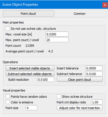 插入選定的可見對象:允許基於選定的可見對象插入點。僅考慮虛擬對象,形狀,超頻樹和點雲。選擇要插入的所有對象,然後最後選擇目標點雲對象。形狀將事先轉換為具有指定構建分辨率的臨時OC樹。插入公差項允許通過指定用於確定是否插入點的最小距離公差來避免重複的點。插入公差> 0.0時,點插入將變慢。